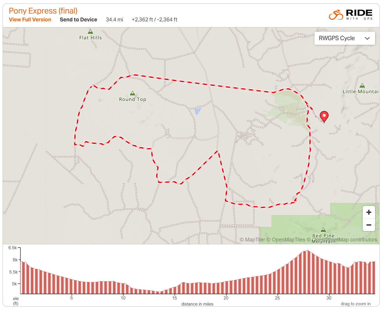 The surface turns quickly to two-track and rocky chunk. Even the sections that look smooth are deceptive, as there’s more hoof traffic than wheel traffic out here. Wind your way around Round Top, appreciating the lower speed of the rougher road and the chance it gives you to look around.